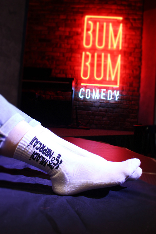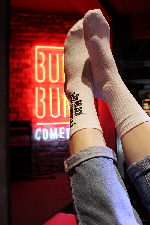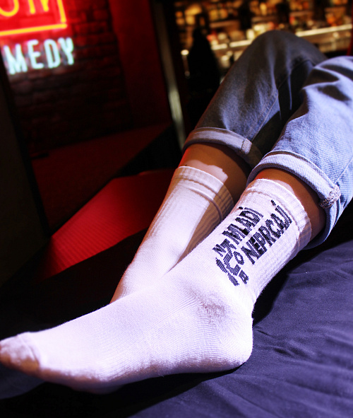 Bílé ponožky, na kterých je všeříkající hláška starého muže – mladí neprcají.